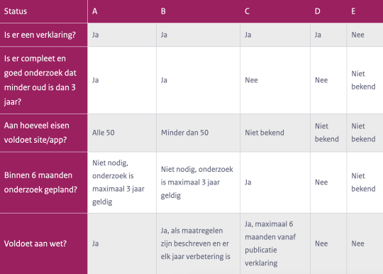 De Wdo geeft je website een nalevingsstatus om aan te geven tot in hoeverre je website voldoet aan de wet. Met status A, B en C voldoe je aan de wet; met status D en E niet. Het doel is om uiteindelijk status A te halen. De richtlijnen voor status B en C sturen hier dan ook op aan. Bij nieuwe websites moet de status bij de livegang van de website A, B of C zijn. Let op de termijnen van de statussen: als de termijn van de status verloopt, ga je automatisch terug naar D.